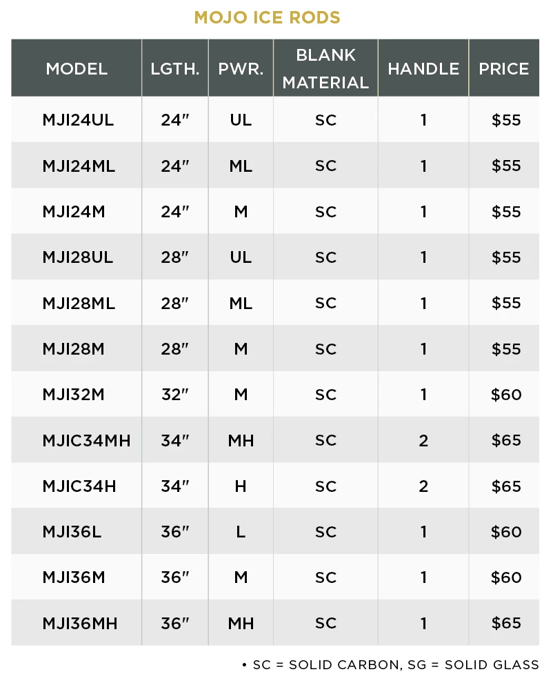 Mojo Ice gets a face-lift for 2020. Sporting a new carbon dust blank and flat finish reel seat, this series retains the proprietary custom reel seat and split-grip handle you’ve come to love. Suited for a variety of ice fishing styles and techniques for panfish, trout, walleye, pike and lake trout, these cosmetic upgrades will surely enhance your fishing experience.