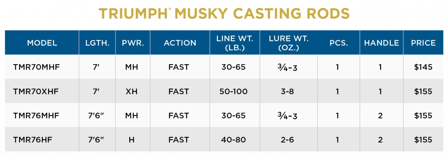 Powerful, fast action Triumph® musky rods are built for savvy anglers seeking the best in performance and value.