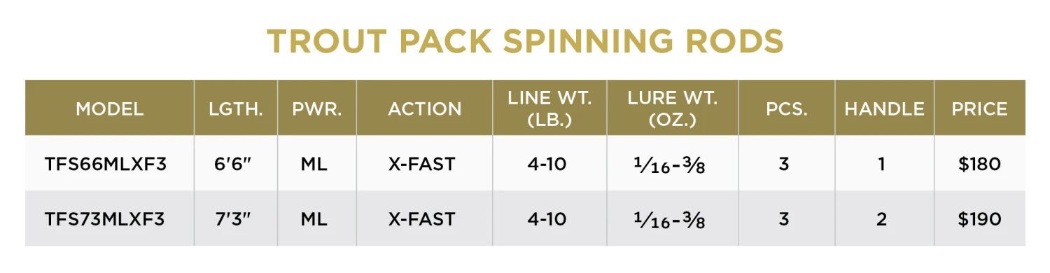 Trout specific three-piece spinning rods built for adventure! Slender profile split grip configurations combined with slim ferrule connections offer multi-piece convenience with one piece performance. These trout specific spinning rods are the ultimate for anglers searching streams far and wide.